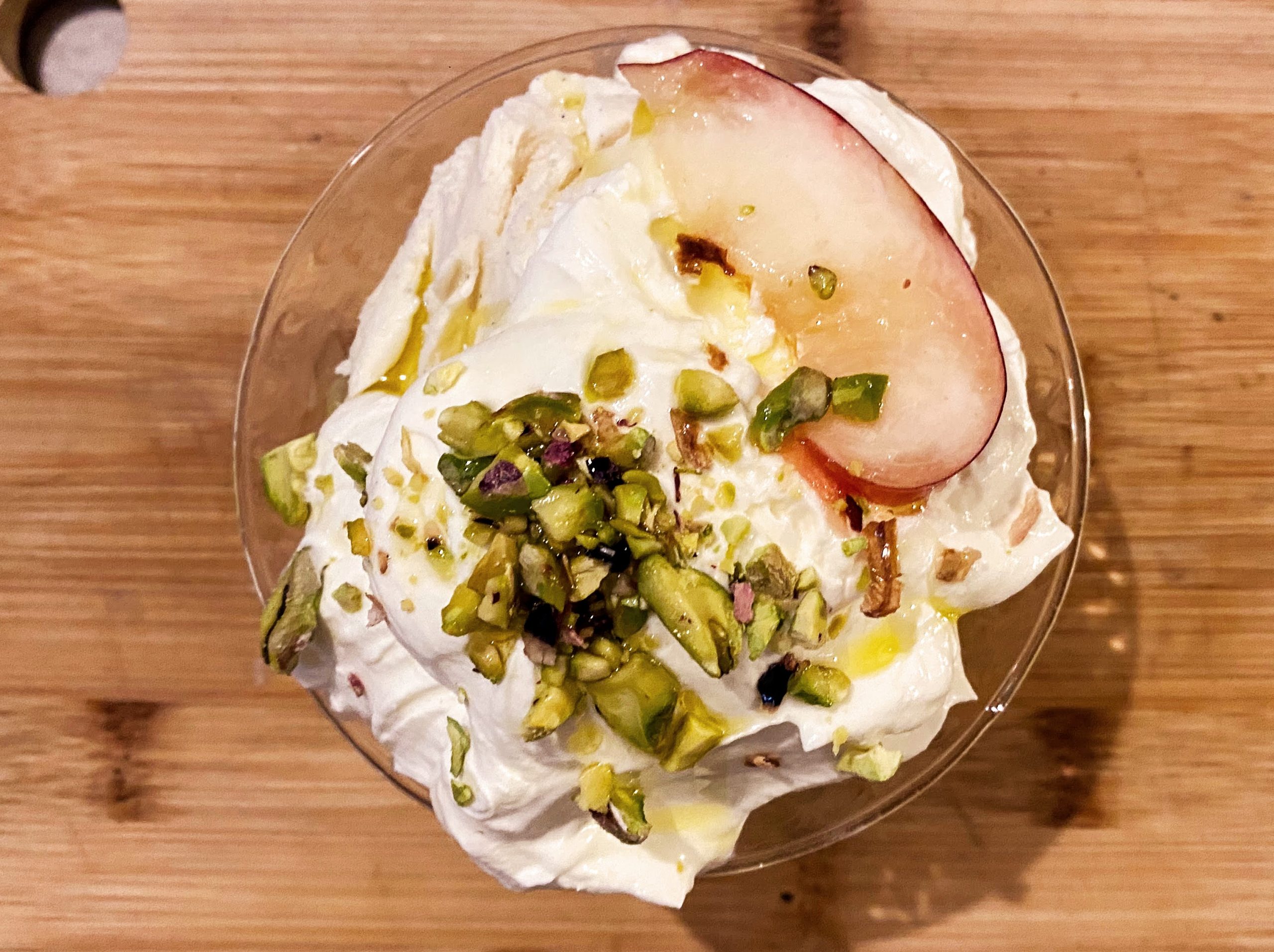 - Déposez 2 cuillères de votre préparation à base de pêches, déposez 2 boules de glaces puis recouvrez avec votre chantilly. Parsemez vis pistaches broyées puis un filet d'huile d'olive240 gr. Crème glacée vanille, Huile d'olive, 1 poignée Pistaches décortiquées