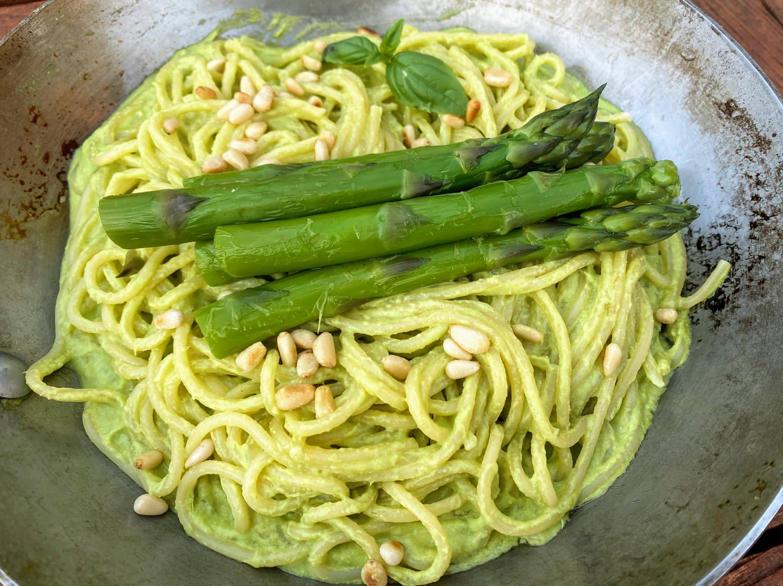 - Dans la recette nous vous conseillons de torréfier les pignons de pin de qui en facilitera la transformation mais donnera également un goût subtile à votre pesto d'asperges vertes.