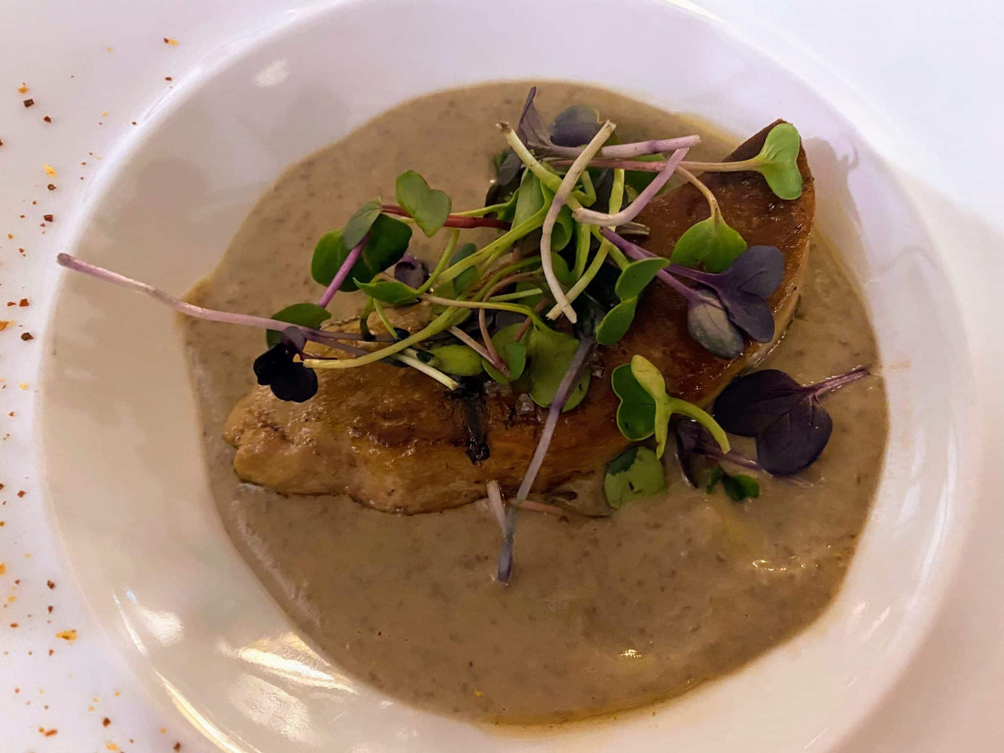 - Dans les bols, versez le potage, déposez-y le tranche de foie gras poêlé